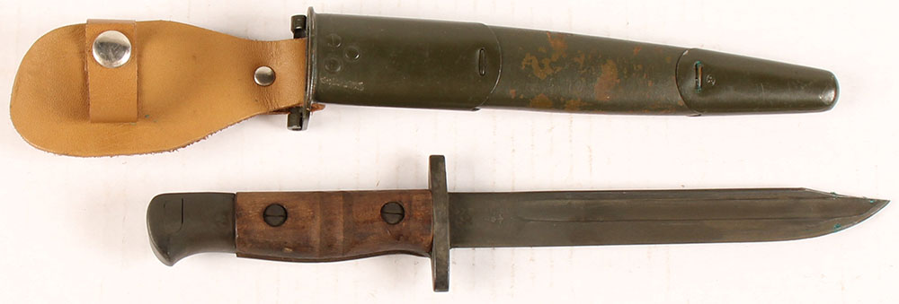 Remington, shortened Pattern 1913 bayonet with sheath & frog. Metal was re-finished with a gray parkerized finish. Markings on blade are faded from re-finish, left side of ricasso is marked ''1913'' over ''2'' ''16'' over ''REMINGTON'' inside a circle, right side of ricasso marked with British proofs. The parkerized finish retains almost full coverage with spots of gray on the blade from sheath wear. Smooth wood grips with two notches in each grip to ID it as a patter 1913, & not a pattern 1907 for the SMLE. The sheath has a green paint finish over the metal & leather, paint flaking/wearing off showing brown leather & gun metal gray. Leather frog has a few scuffs & dings. The back of the sheath is marked ''GF'' in a circle. Grade: Excellent - Value: 30 to 90