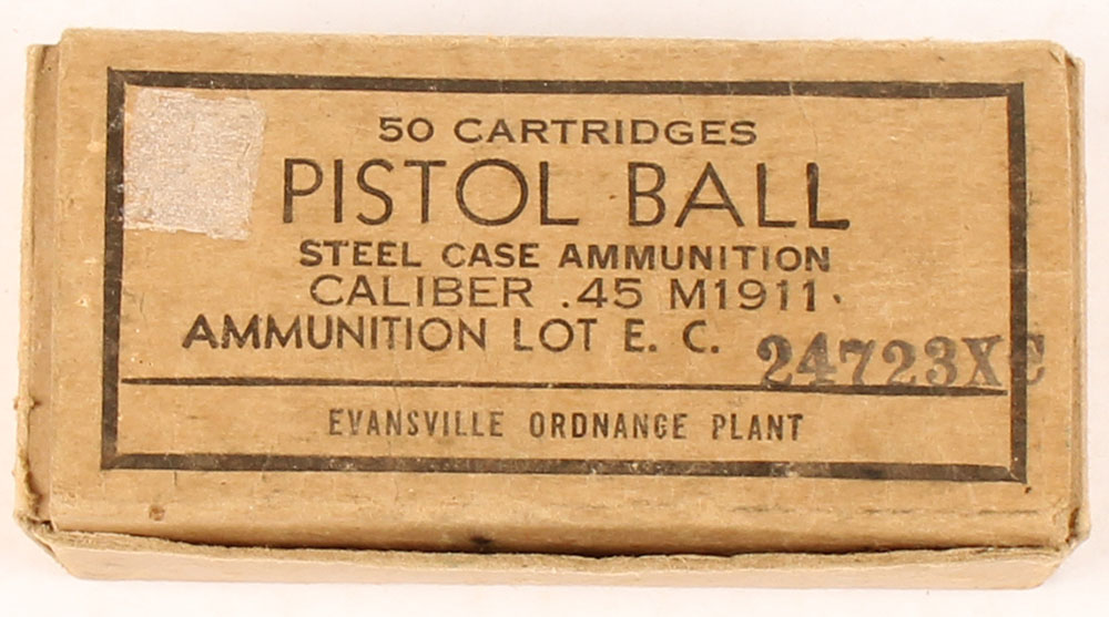 Evansville, .45 ACP M1911 Ball, 50 Rd. box, partial with 49 Rds. Of Remington ''RA 68'' H/S brass case ammo, buff box with black print, box is solid with rub marks & handling wear, ammo is excellent. Grade: Very Good + - Value: 20 to 30