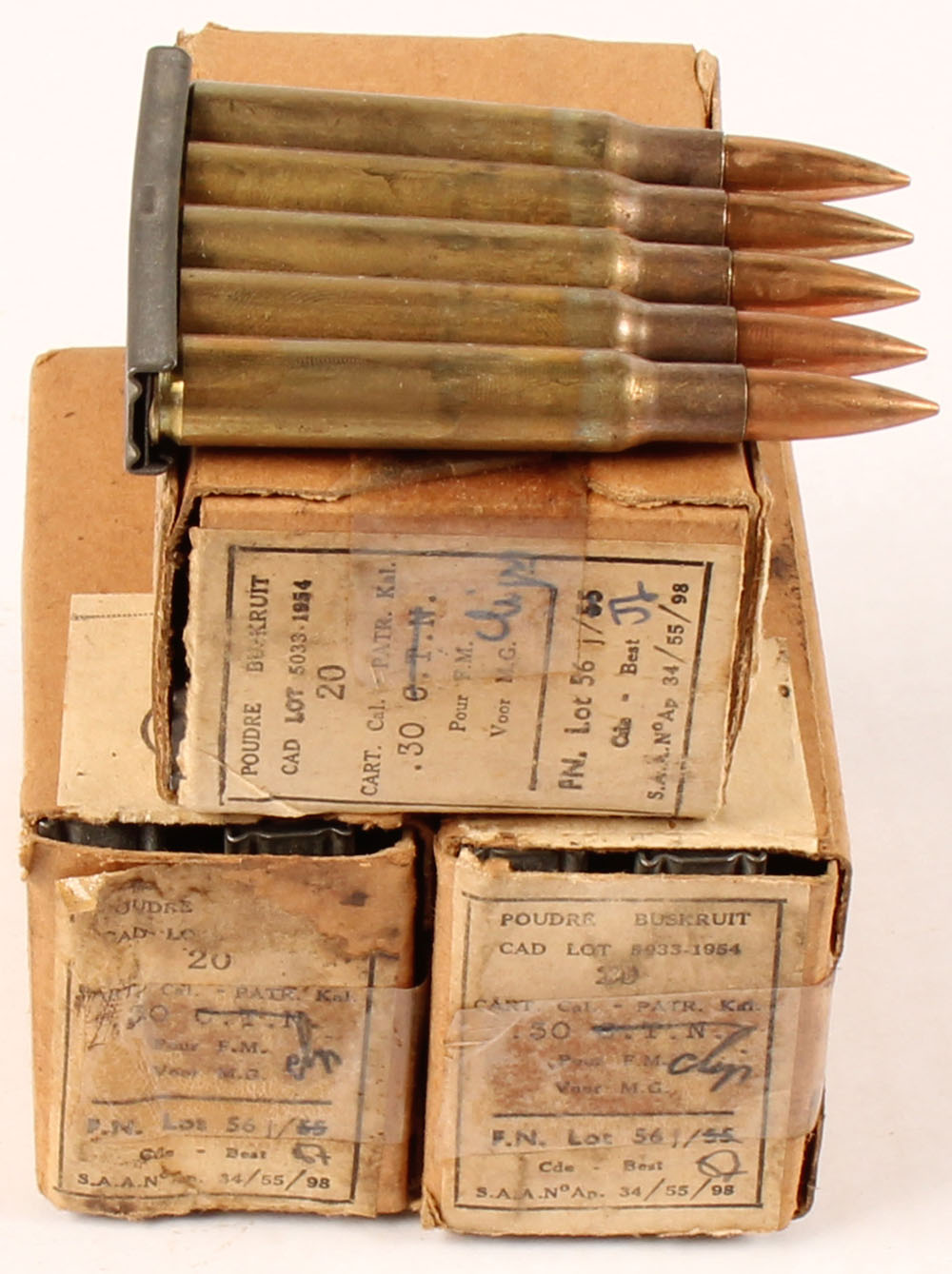 Lot of three, FN, .30-06, on clips, 20 Rd. boxes, all Full, 1pc, brown boxes with buff labels & black print, boxes have rub wear, tape & age soiling, ammo is very good, possible corrosive primers. Grade: Very Good - Value: 30 to 60