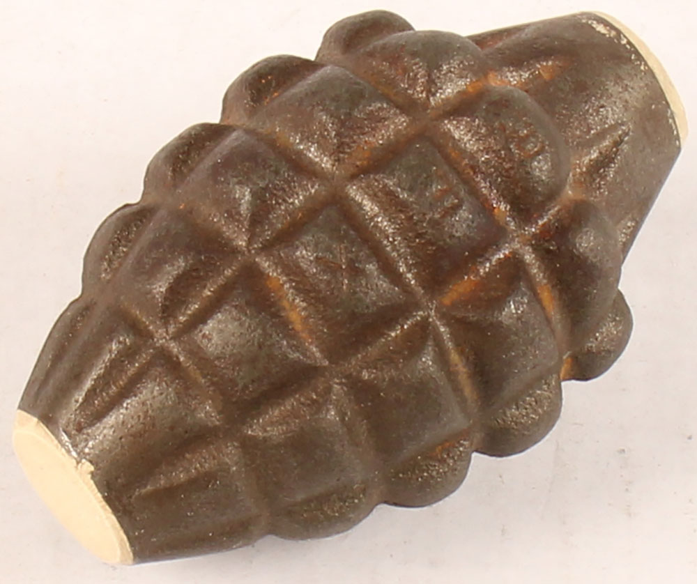 US, Mk2 Pineapple empty grenade body, no fuse head, top & bottom painted white, body has spots of rust, marked ''R F X''. Grade: Very Good - Value: 10 to 30