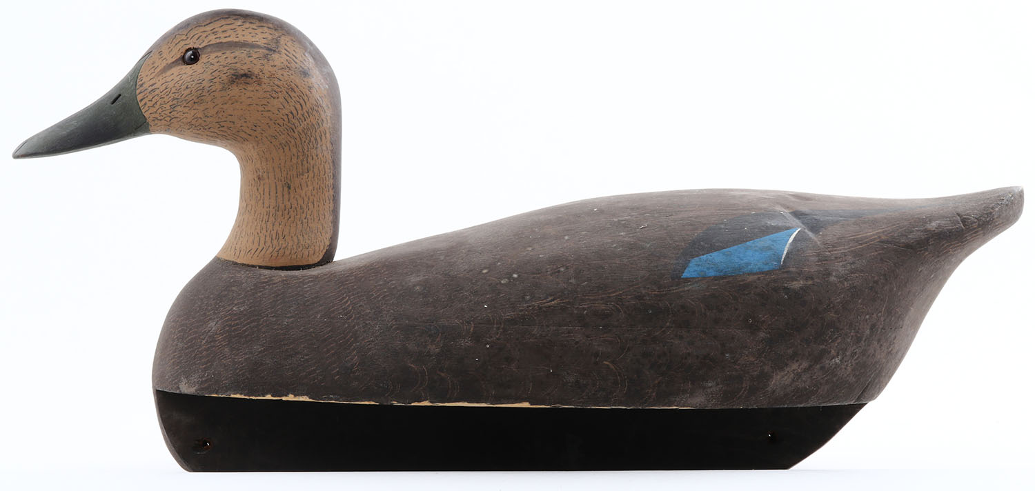 Black Duck by Ken Harris, Woodville, NY, glass eyes, structurally excellent, hollow wood, well marked on bottom, original paint is very nice, 18 1/4'' OAL. Grade: Excellent + - Value: 100 to 250