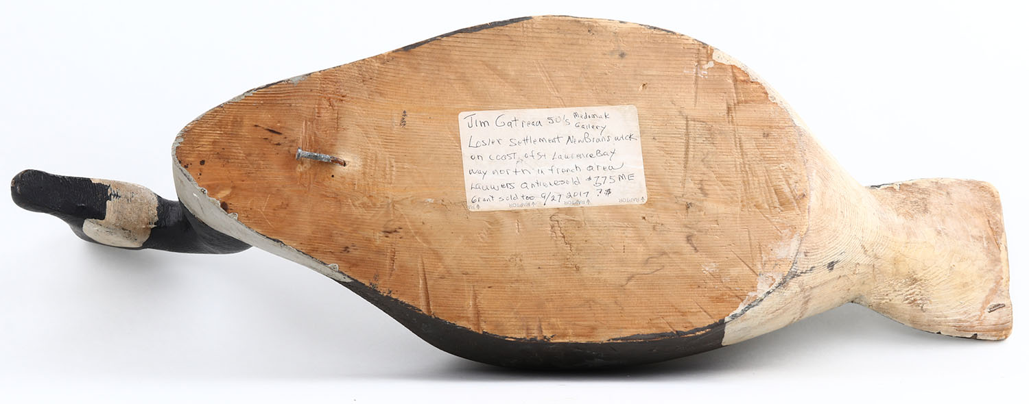 Early Canada Goose by Jim Gatreau, Losier Settlement in New Brunswick Canada, circa 1950's, no eyes, hollow wood, original paint, structurally excellent, 23'' OAL. Grade: Excellent - Value: 100 to 400
