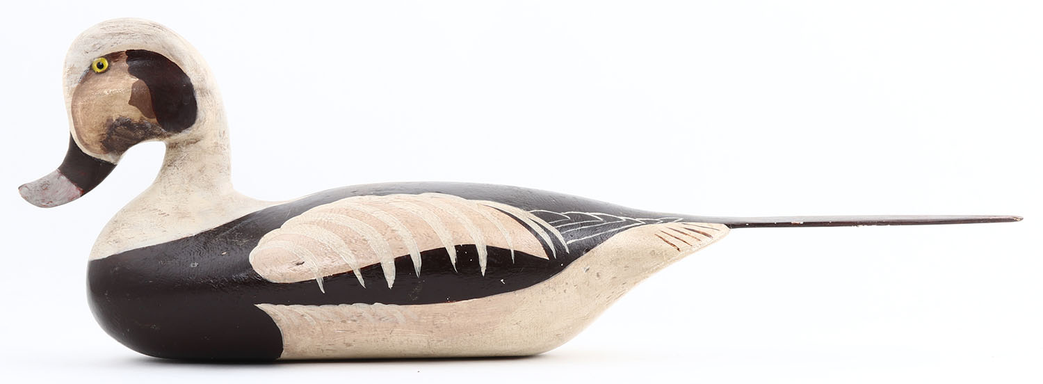 Old Squaw Drake by unknown maker, GE, solid wood, original paint extra long tail, structurally excellent, 21'' OAL. Grade: Excellent - Value: 70 to 200