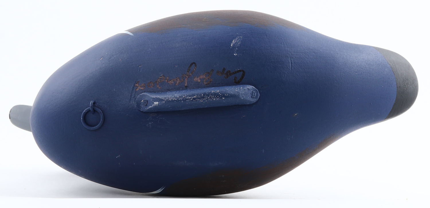 Harlequin Drake by Capt. Bob Jobes, Havre De Grace, MD , painted eyes, solid wood, original paint, signed on bottom by CAPT. BOB JOBES, structurally excellent, 14'' OAL. Grade: Excellent ++ - Value: 50 to 100