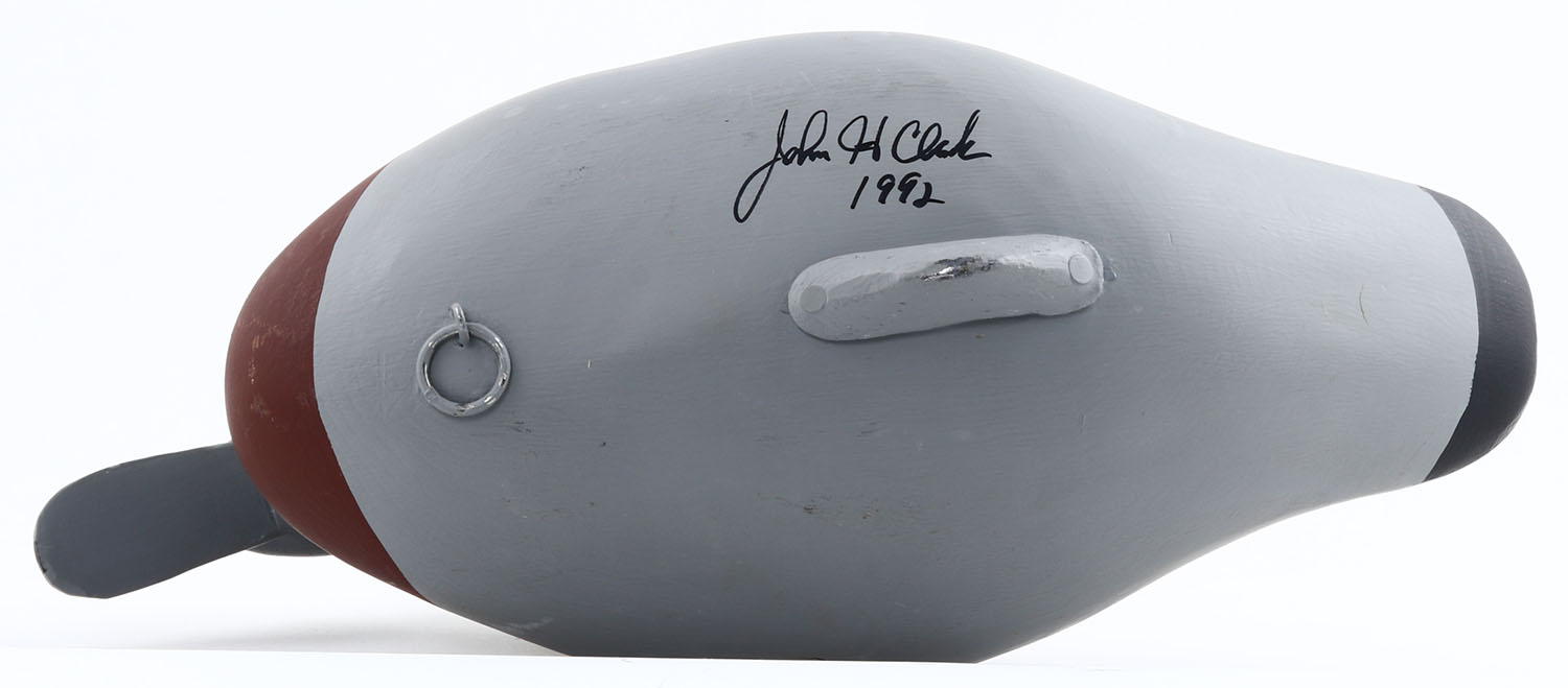 Widgeon Drake by John H. Clark, Havre De Grace, MD, painted eyes, solid wood, original paint, structurally excellent, signed on bottom, 14 1/2'' OAL. Grade: Excellent ++ - Value: 40 to 80