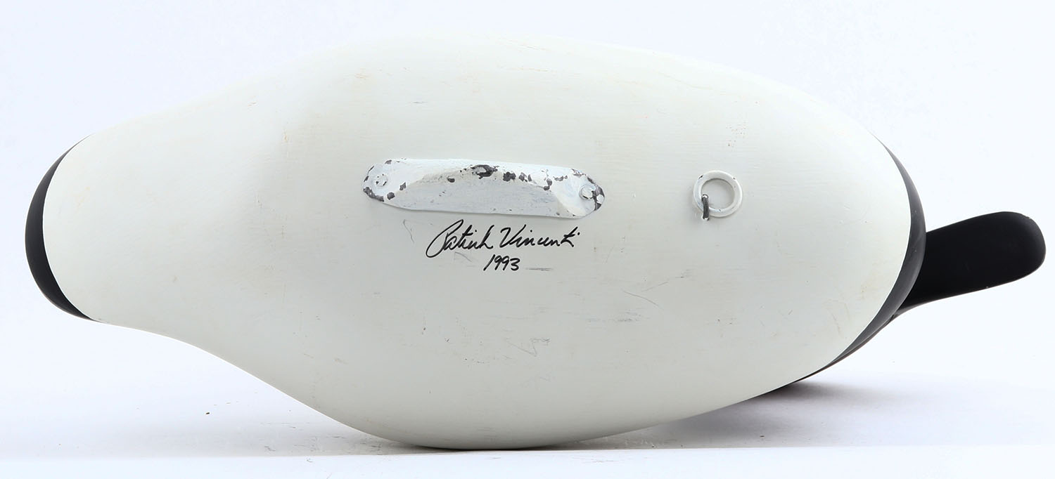 Canvasback Drake by Patrick ''Pat'' Vincent, Churchville, MD, painted eyes, solid wood, original paint, structurally excellent, signed on bottom, 16'' OAL. Grade: Excellent ++ - Value: 50 to 100