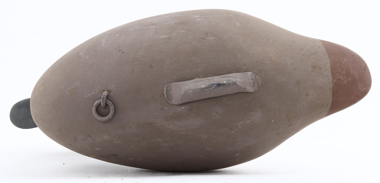 Bluebill Hen by McMillian?? MD, painted eyes, solid wood, original paint, structurally excellent, signed on bottom, 14'' OAL. Grade: Excellent + - Value: 40 to 80