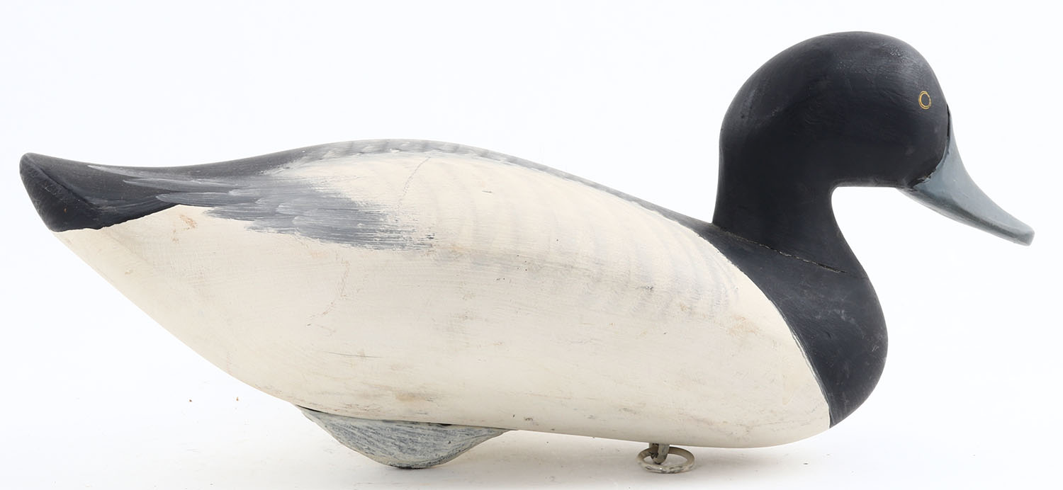 Bluebill Drake by R. Madison Mitchell, Havre de Grace, MD, PE, solid wood, original paint, signed on bottom, 15'' OAL. Grade: Excellent + - Value: 100 to 200