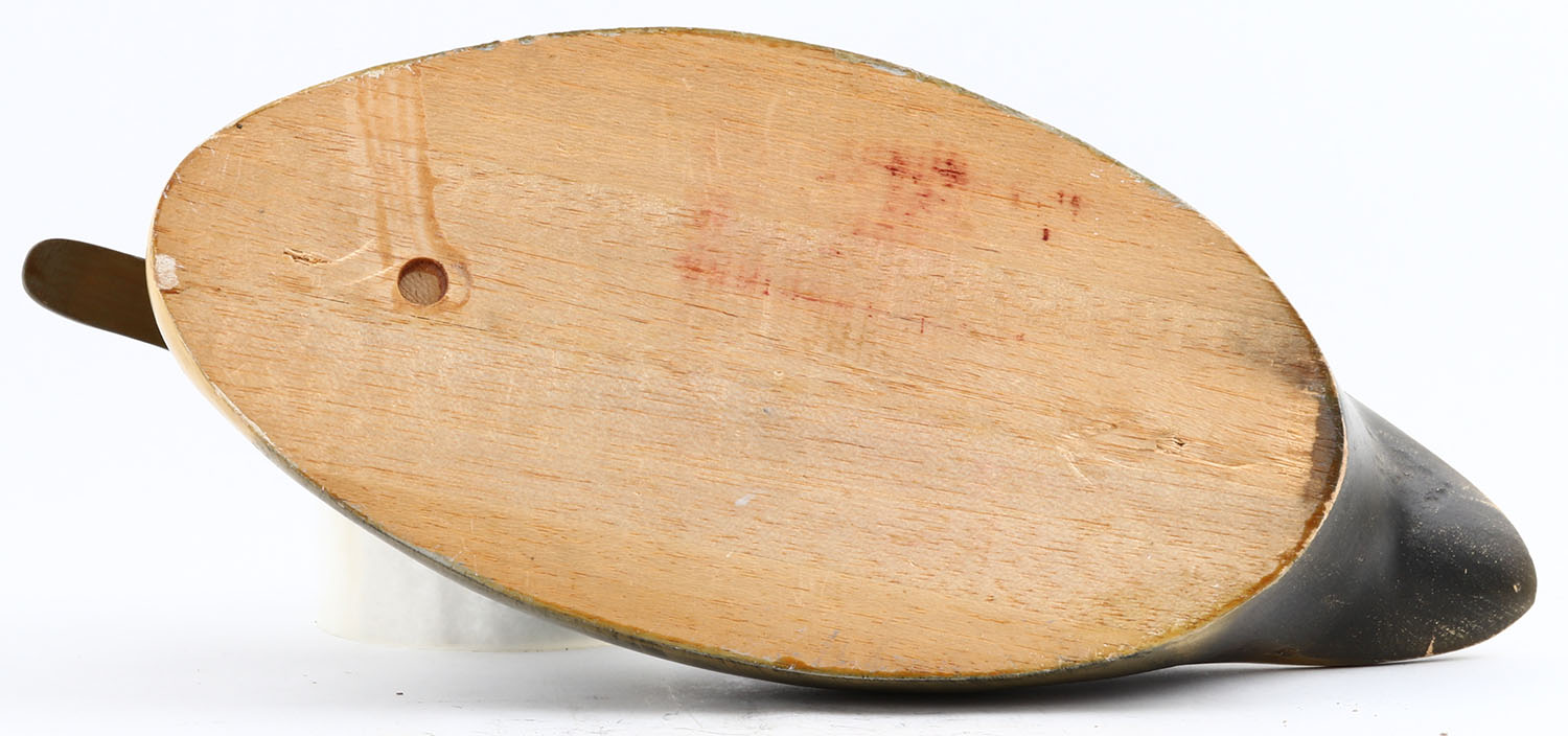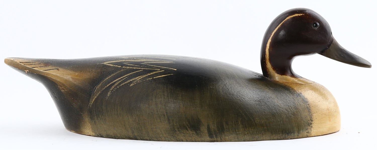 Pintail Drake by Wildfowler Decoy Co. Old Saybrook Conn., GE, pine wood, original paint, no stamp on bottom, circa 1939, 16'' OAL. Grade: Excellent - Value: 200 to 400