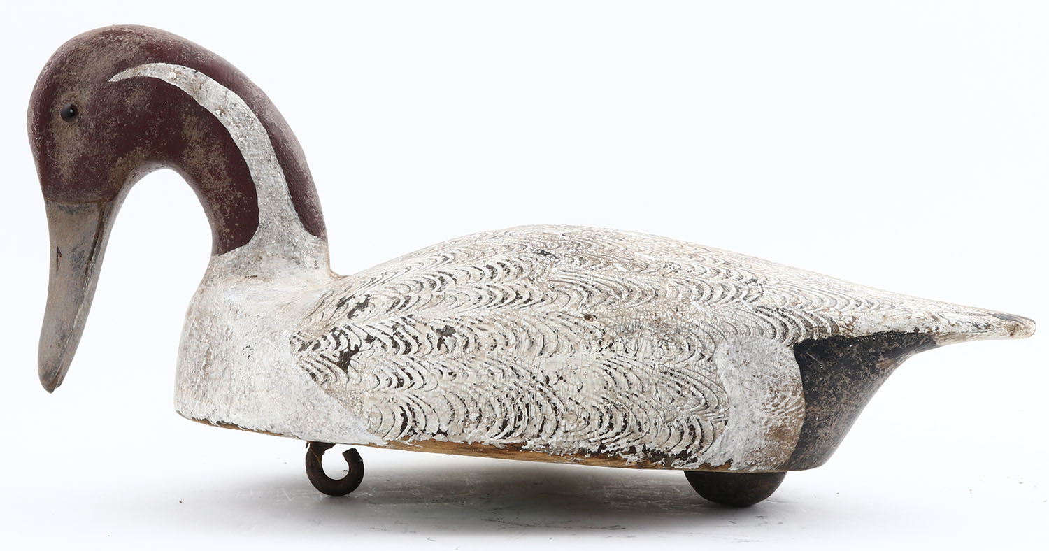 Preening Pintal Drake by unknown maker, GE, solid wood, original paint is worn, structurally excellent, 13 1/2'' OAL. Grade: Excellent - Value: 30 to 90