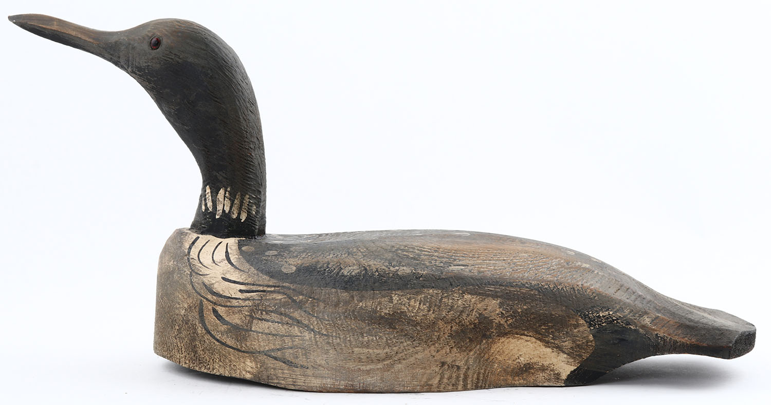 Loon by Tom Martindale, Ontario, Canada, glass eyes, hollow wood, original paint, structurally excellent, signed on bottom, 17'' OAL. Grade: Excellent - Value: 50 to 100