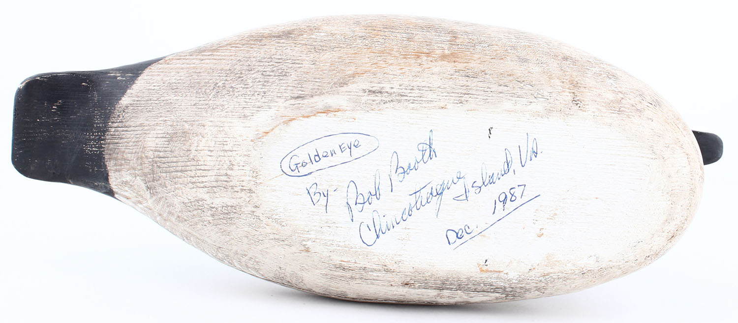 Goldeneye Drake by Bob Booth, Chincoteague Island, VA, PE, hollow wood, original paint, structurally excellent, signed on bottom, 13'' OAL. Grade: Excellent - Value: 40 to 80