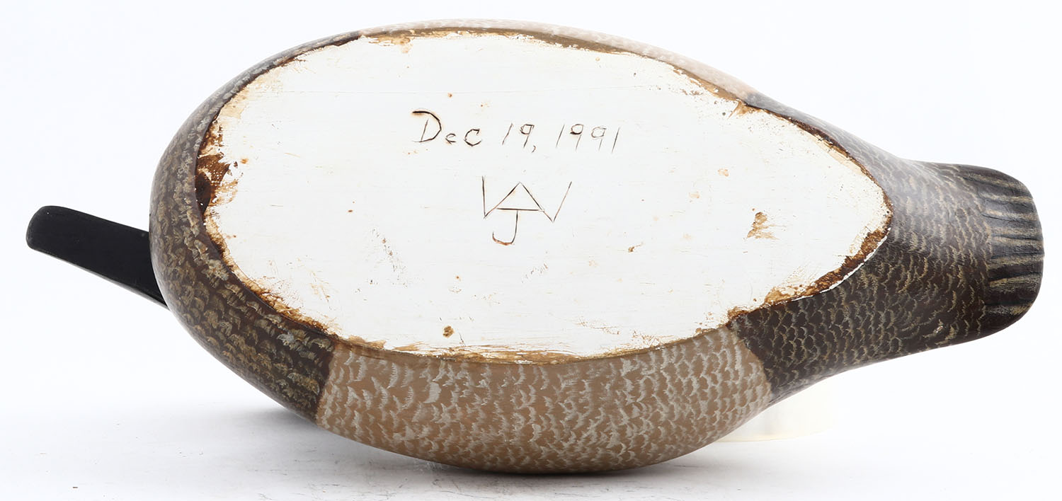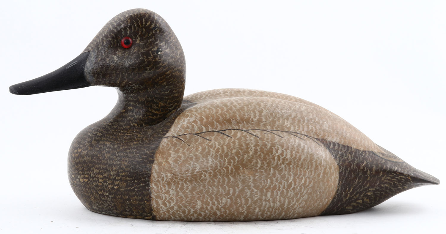 Canvasback Hen by WJ, GE, hollow wood, original paint, structurally excellent, signed on bottom, 14'' OAL. Grade: Excellent - Value: 20 to 80