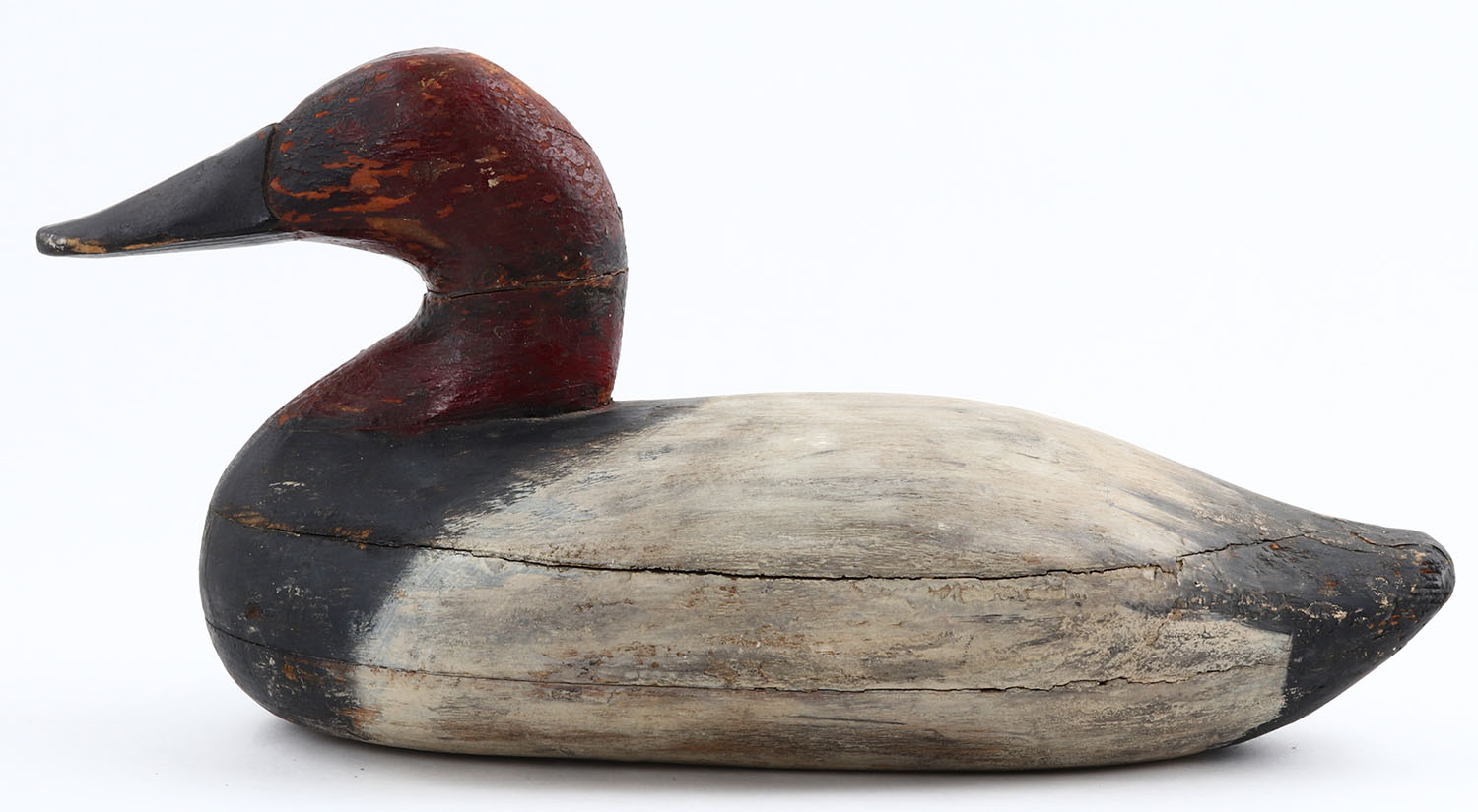 Canvasback Drake by unknown maker, no eyes, solid wood, original paint, neck has crack & been repaired, 14 OAL. Grade: Very Good + - Value: 50 to 100