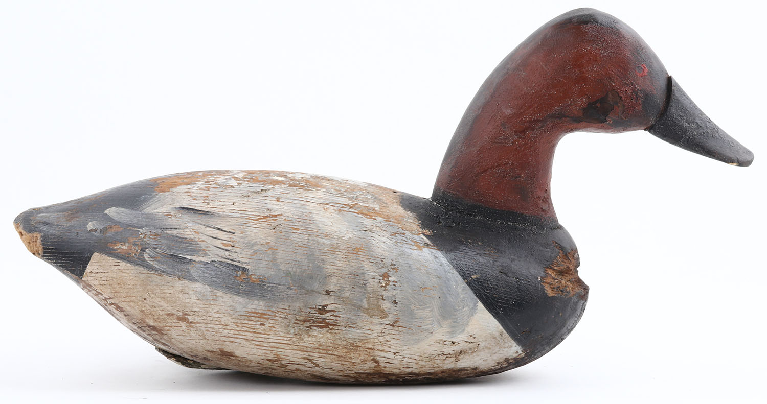 Early Canvasback Drake by unknown maker, PE, solid wood, original paint show wear, show swear to tail, 16'' OAL. Grade: Very Good - Value: 30 to 100