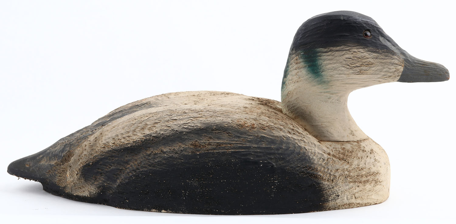 Eider Drake by Herters Decoy Co., Waseca, MN, 1893 series, glass eyes, solid wood, original paint, structurally excellent, marked on bottom. Grade: Excellent ++ - Value: 50 to 300