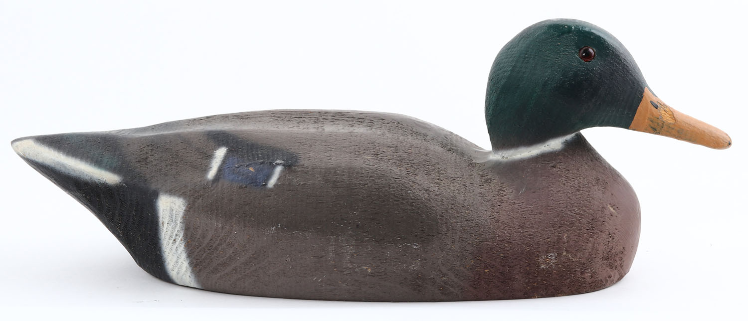 Mallard Drake by Herters Decoy Co., Waseca, MN, 1893 series, glass eyes, solid wood, original paint, structurally excellent, marked on bottom. Grade: Excellent ++ - Value: 50 to 300