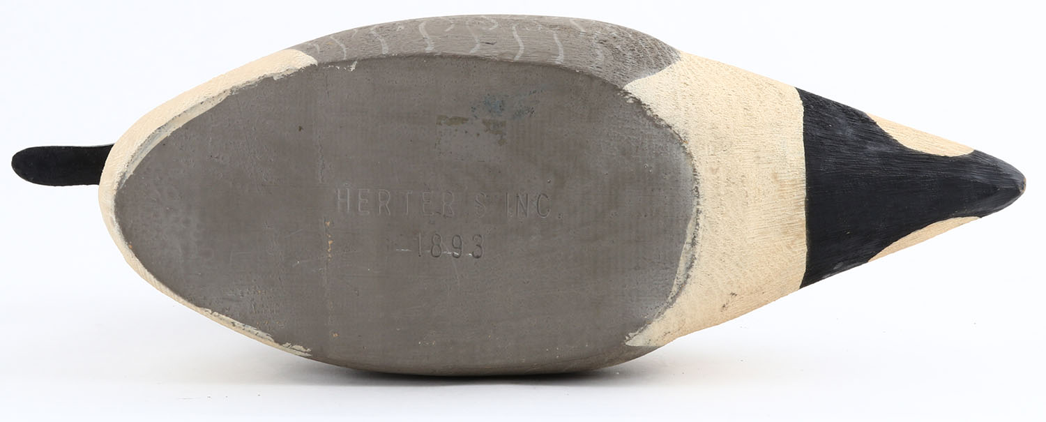 Pintail Drake by Herters Decoy Co., Waseca, MN, 1893 series, glass eyes, solid wood, original paint, structurally excellent, marked on bottom. Grade: Excellent ++ - Value: 50 to 300