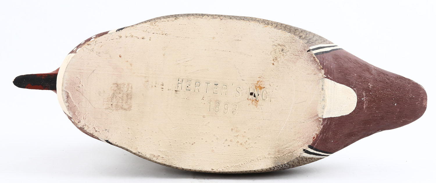 Woodduck Drake by Herters Decoy Co., Waseca, MN, 1893 series, glass eyes, solid wood, original paint, structurally excellent, marked on bottom. Grade: Excellent ++ - Value: 50 to 300