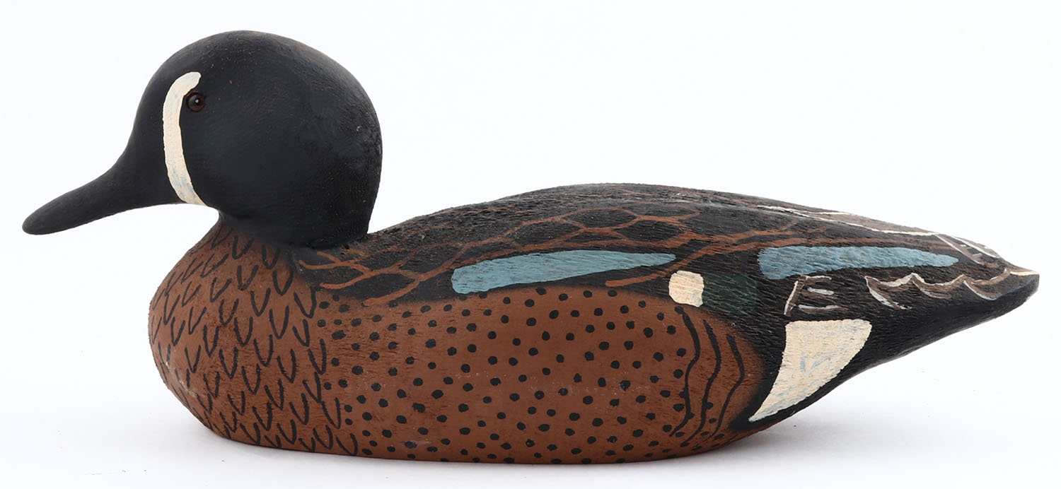Bluewing Teal Drake by Herters Decoy Co., Waseca, MN, 1893 series, glass eyes, solid wood, original paint, structurally excellent, marked on bottom. Grade: Excellent ++ - Value: 50 to 300
