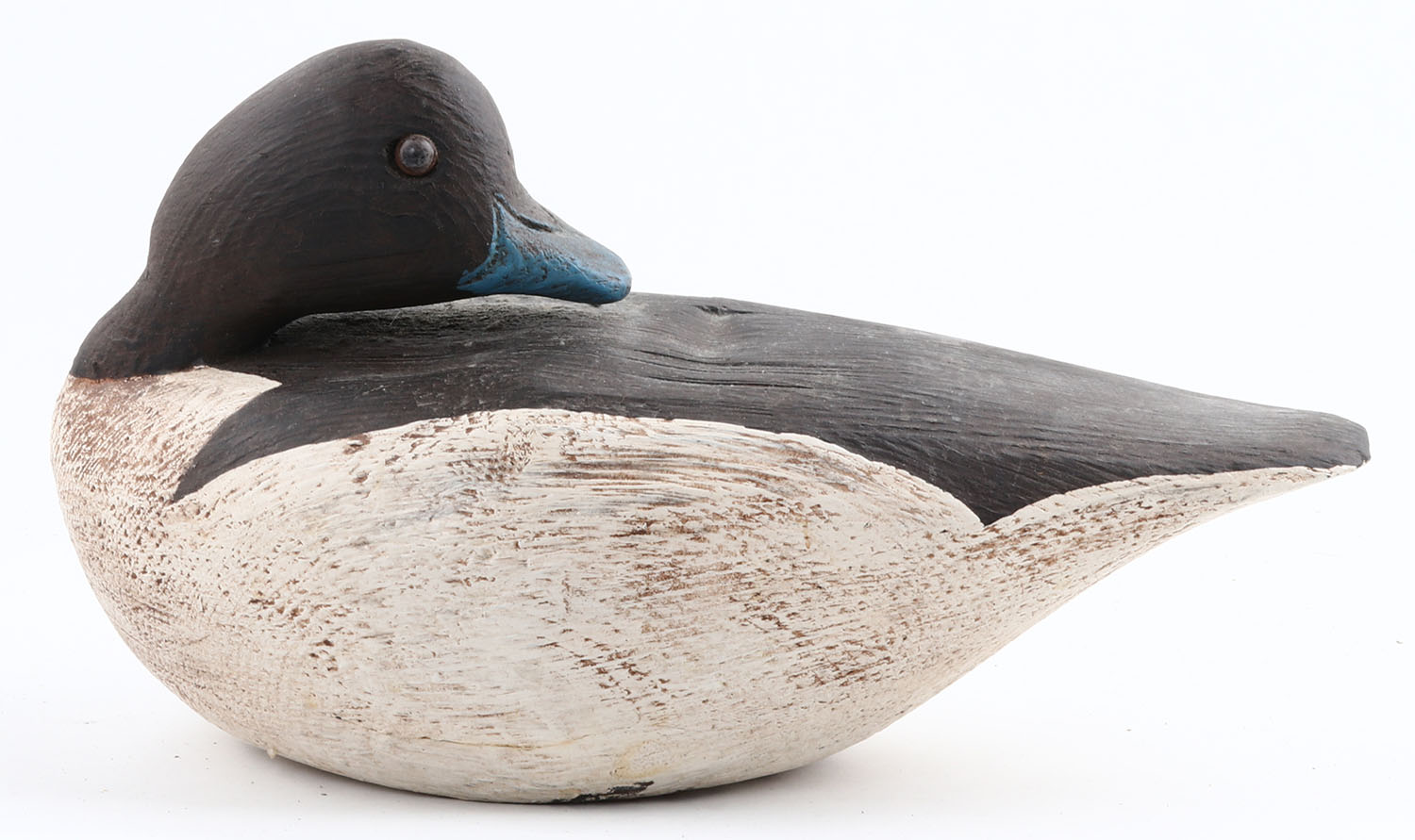 Preening Bluebill Hen by unknown maker, GE, solid wood, original paint, structurally excellent. Grade: Excellent - Value: 30 to 60