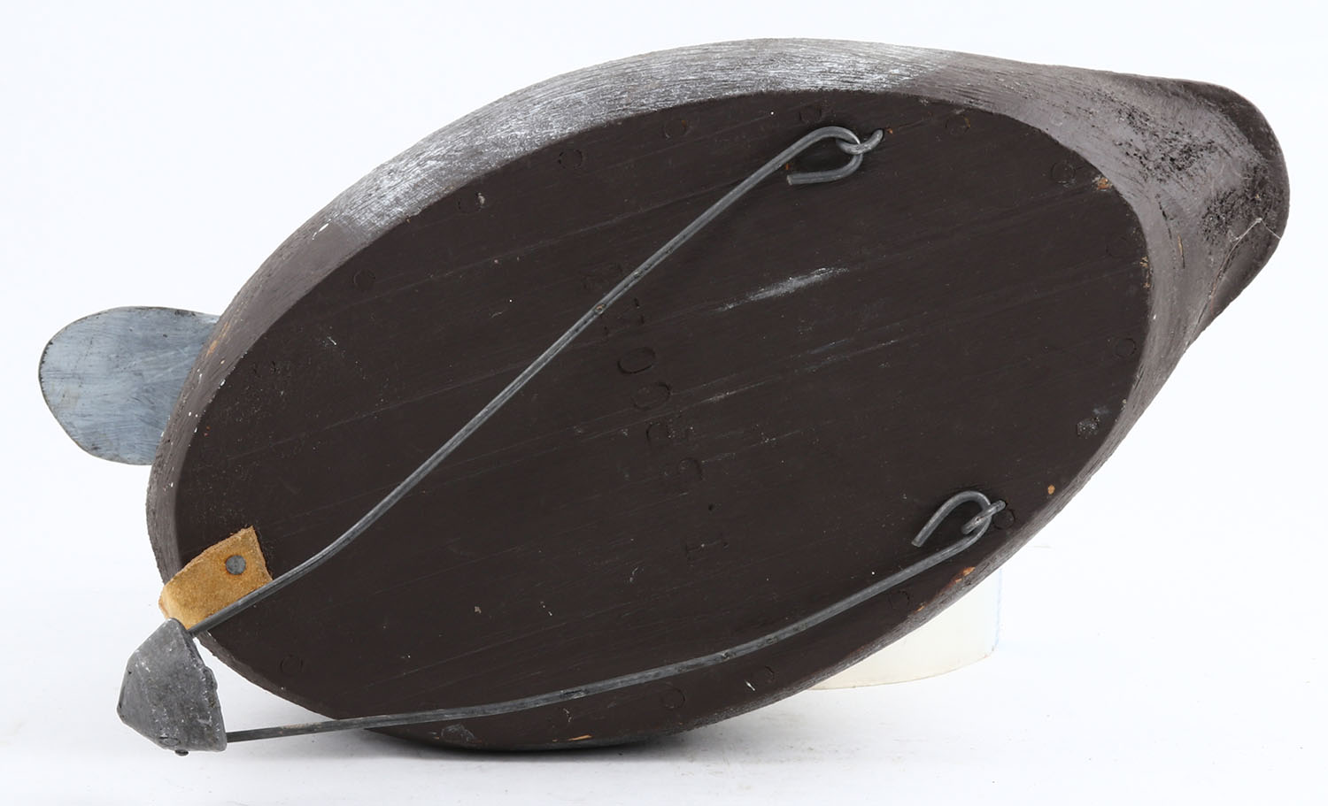 Bluebill Hen by unknown maker, branded T. Brooks, GE, hollow wood, original paint, has swing weight, structurally excellent. Grade: Excellent - Value: 40 to 80