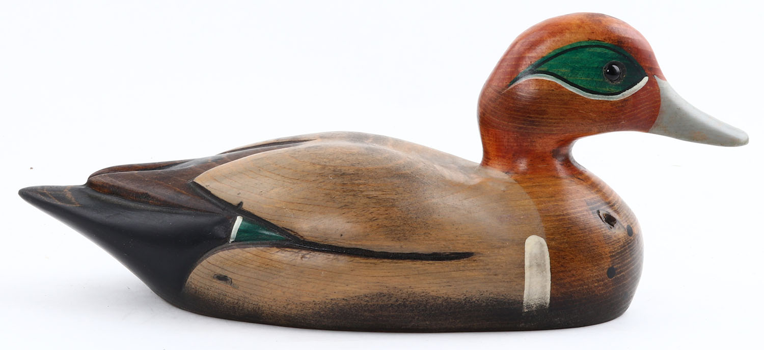 Greenwing Teal Drake by Tom Taber, GE, solid wood, original stain, structurally excellent. Grade: Excellent ++ - Value: 20 to 60