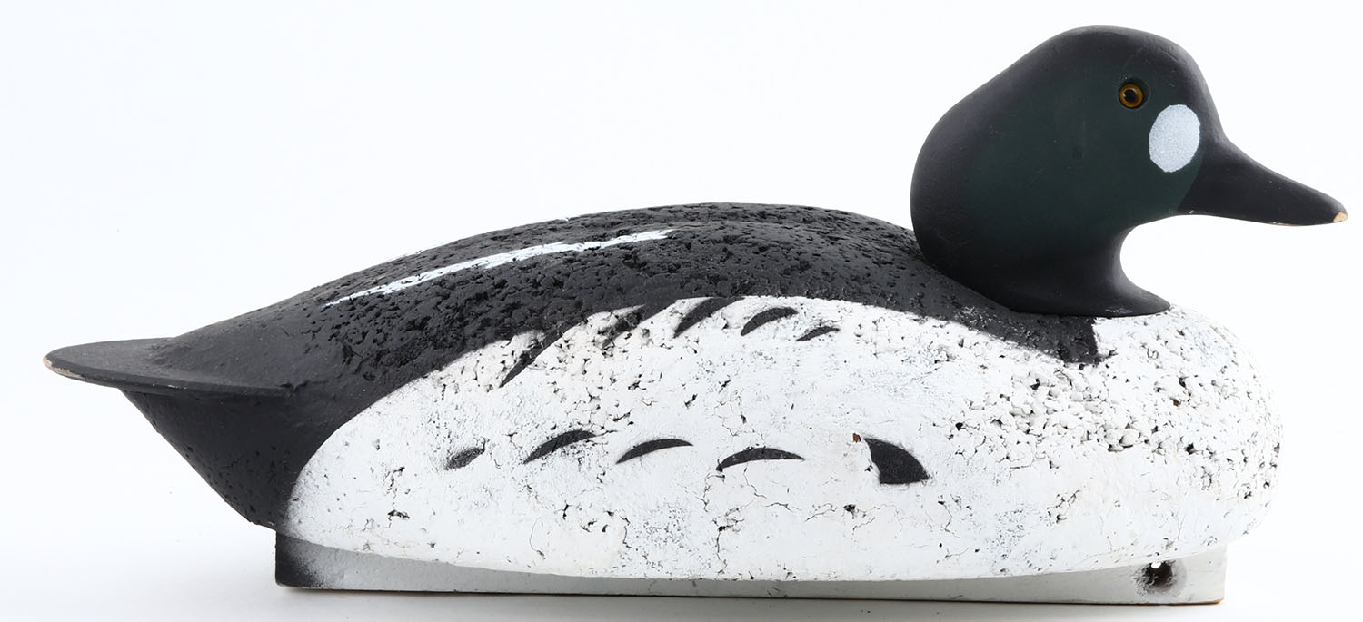Goldeneye Drake by LL Bean, unmarked on keel, glass eyes, solid cork body, wood head, original paint, structurally excellent, 15'' OAL. Grade: Excellent ++ - Value: 20 to 60