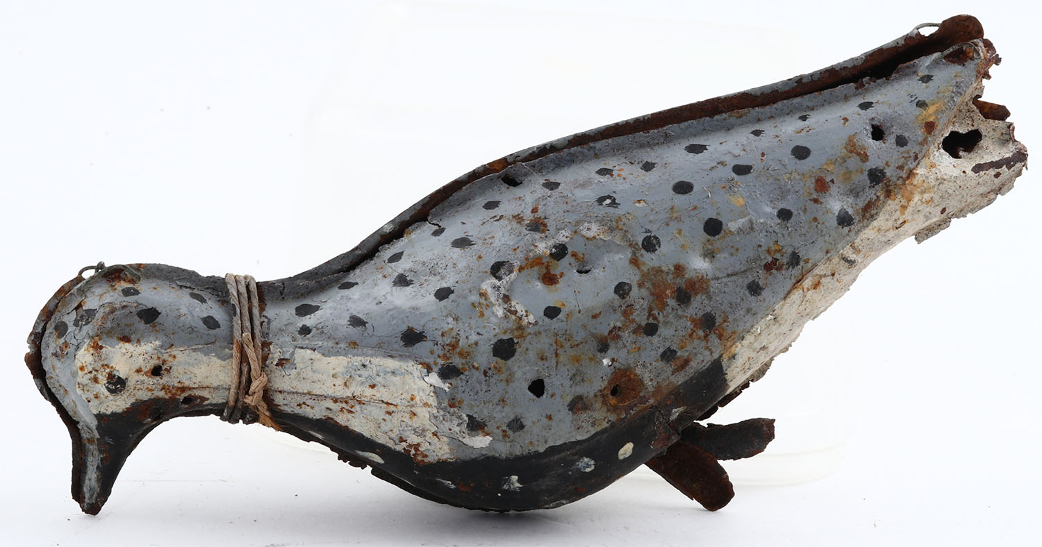 Metal 2pc. Tinny, Shorebird by Strater & Sohier, Boston MA, painted eyes, with wire hinges, dowel with no base, original paint, 10'' OAL. Grade: Excellent - Value: 50 to 200