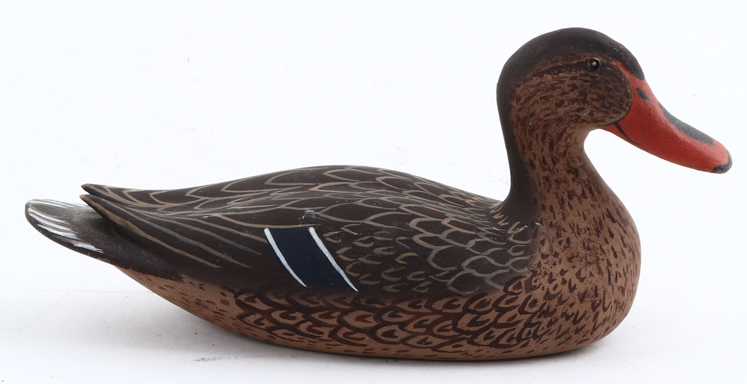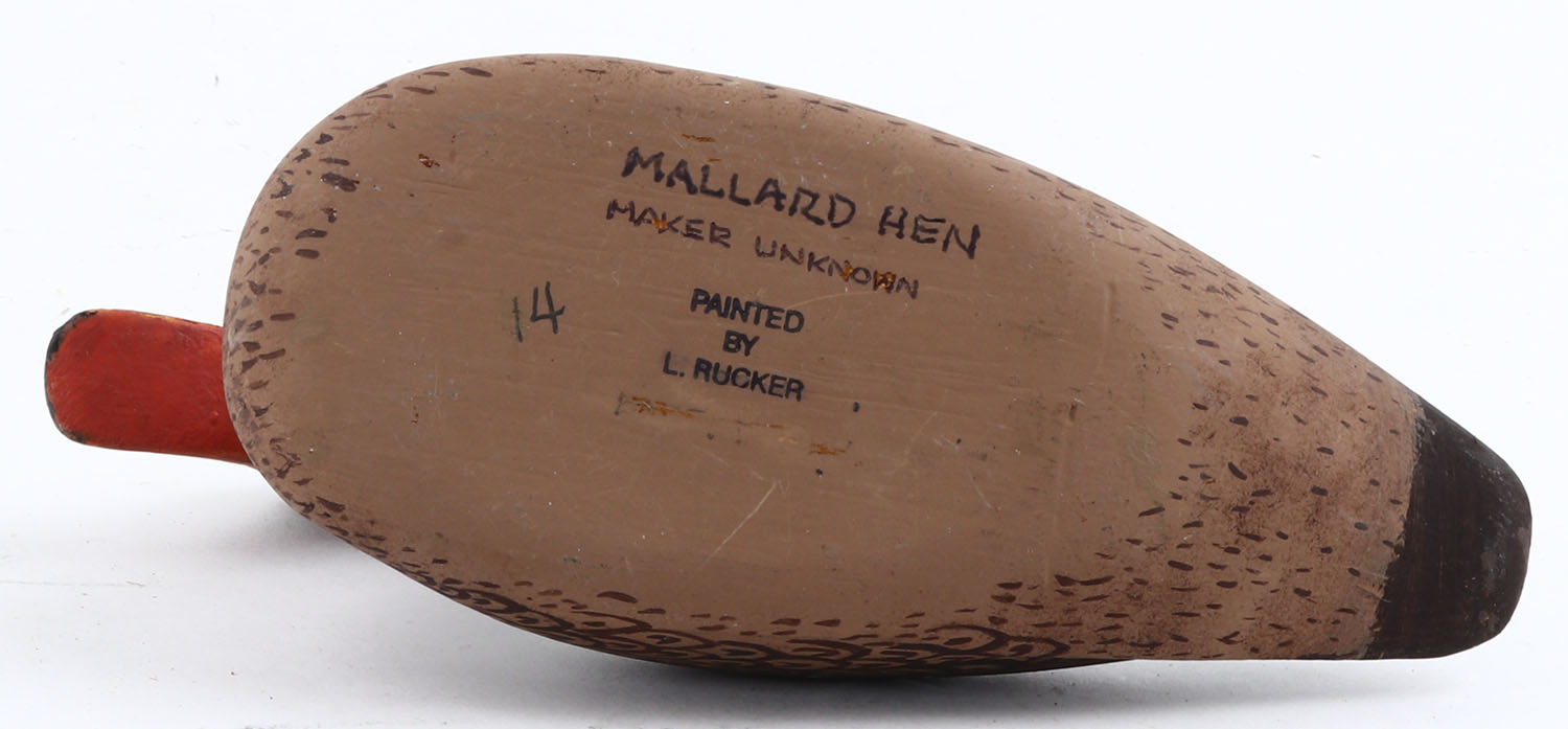 Miniature Mallard Hen by unknown maker & painted by Larrry Rucker and so marked on bottom, PE, solid wood, mint paint, 6'' OAL. Grade: MINT - Value: 30 to 60