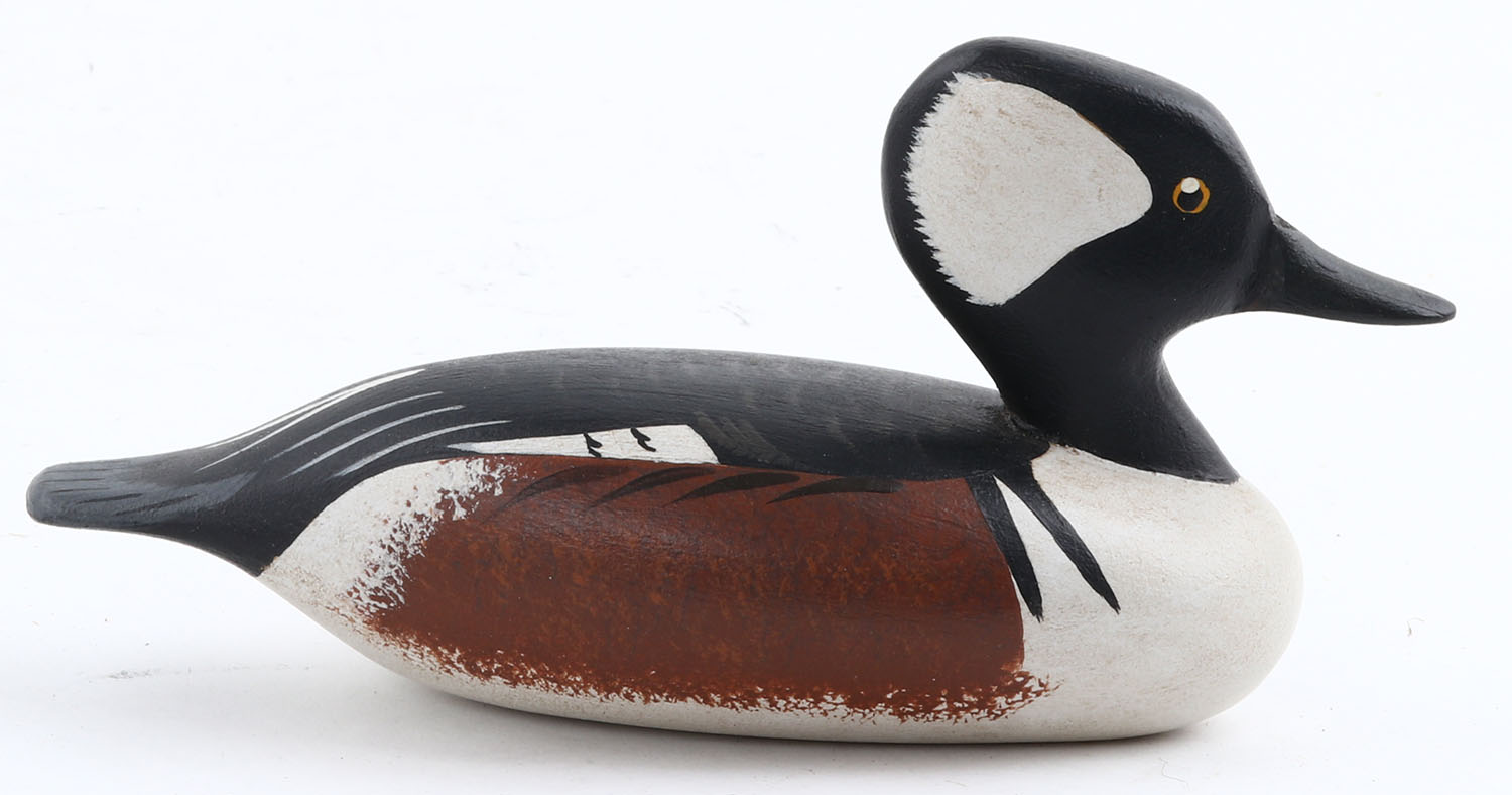 Miniature Hooded Merganser Drake by Juile Bustir and so marked on bottom, PE, solid wood, mint paint, circa 1965, 6'' OAL. Grade: MINT - Value: 30 to 60