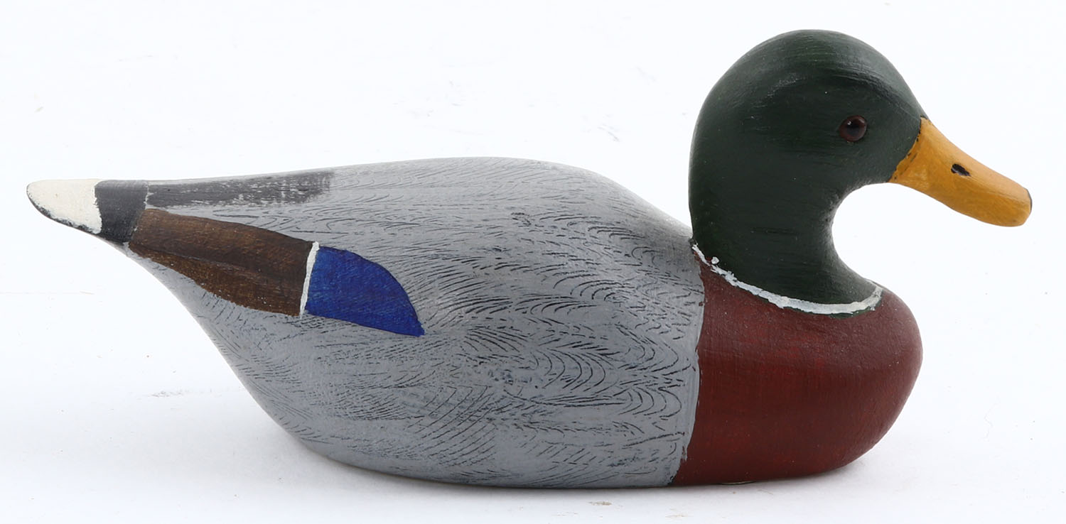 Miniature Mallard Drake by Herb Daisey Jr., Chincuteaque, VA and so marked on bottom, GE, solid wood, mint paint, 5 1/2'' OAL. Grade: MINT - Value: 10 to 30