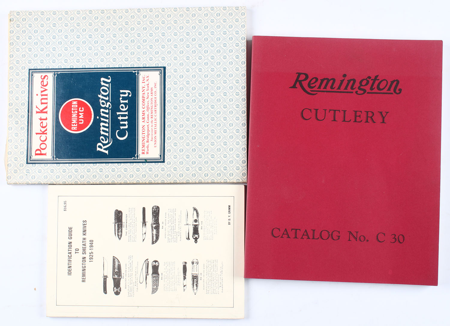 Lot of 3 (1) Identification Guide to Remington Sheath Knives 1925-1940 by D.Y. Grimm, 6'' x 9''. (1) Remington Cutlery Catalog: Pocket Knives, 8 1/2'' x 11''. (1) Remington Cutlery Catalog No. C 30, 8 1/2'' X 11''. All softcovers very good, pages clean, bindings tight, Grade: Very Good ++ - Value: 40 to 100