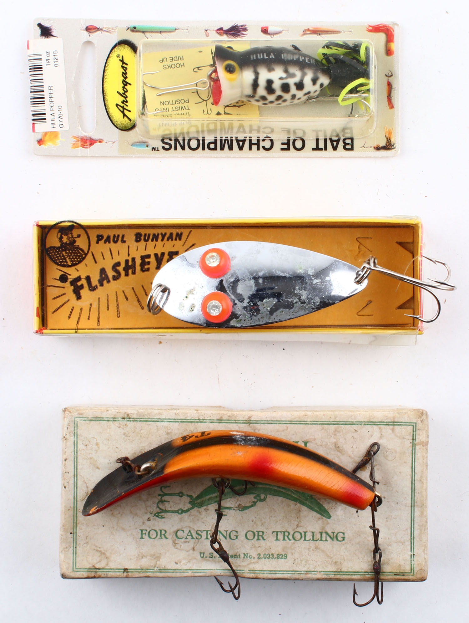 Lot of 3- mixed lures, all different colors/patterns, one is NIB. Grade: Excellent - Value: 10 to 50
