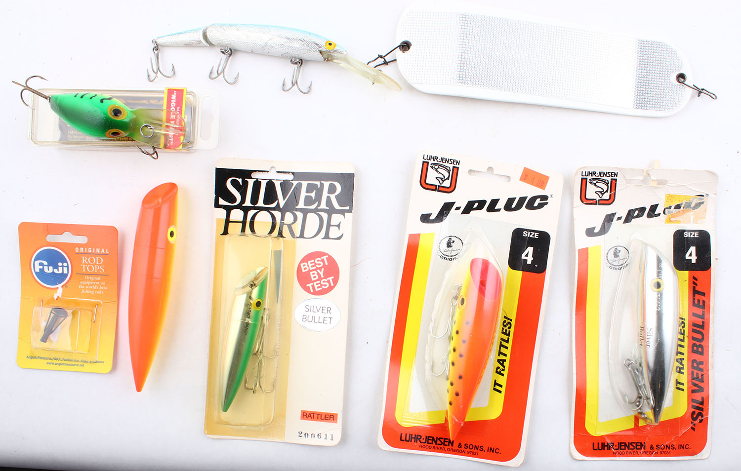 Lot of 8- fishing lures, flasher & rod top, some are NIB. Grade: Excellent - Value: 10 to 50