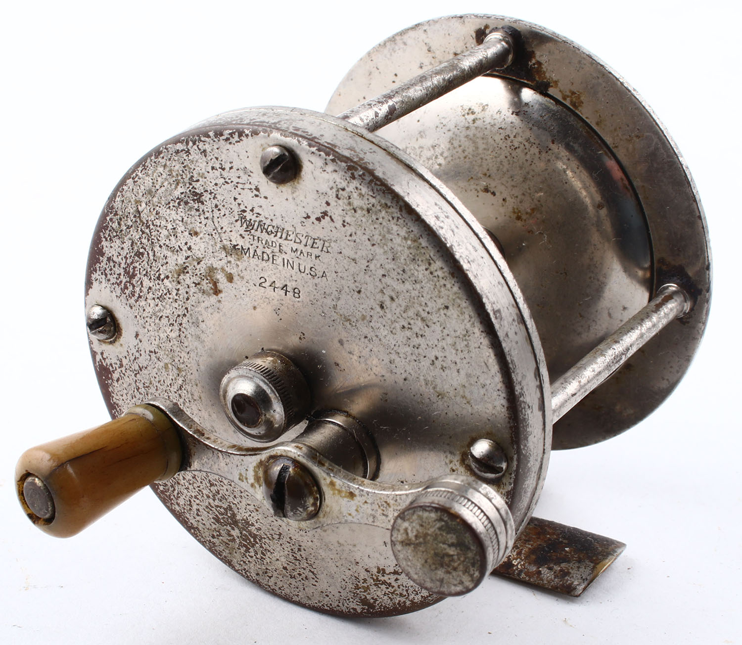 Winchester No. 2448, 100yd, single handle, slightly bent, marked on right side plate & bottom of reel seat, strong click, smooth reel turn. Grade: Very Good - Value: 10 to 40