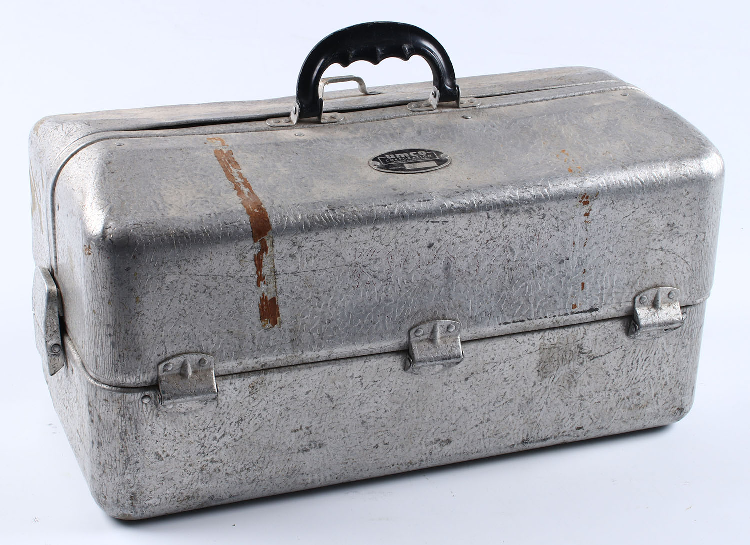 | UMCO Corp. metal tackle box, with an assortment of fishing tackl...