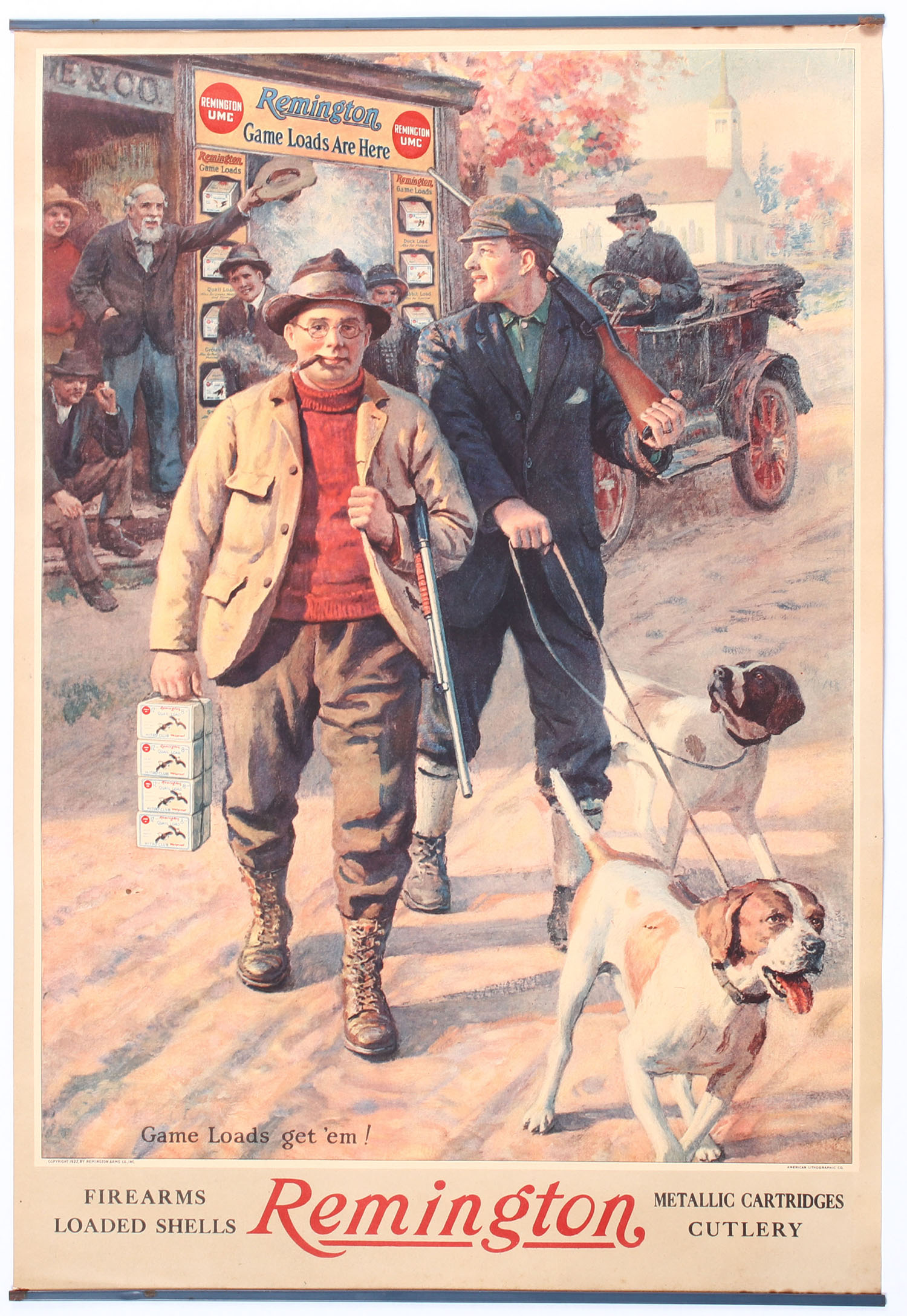 1922 Remington Game Loads Poster, ''GAME LOADS GET 'EM!'', picture a self portrait of Philip R. Goodwin (Artist), shows him leaving a Remington sporting goods store with 4 - 2pc shotshell boxes, a pump shotgun & his hunting dogs, dated 1922, 15'' x 22 1/4'', has metal bands top & bottom with original paper hanger, small tear in top right corner & light age soiling against bands. Grade: Excellent + - Value: 2000 to 4000
