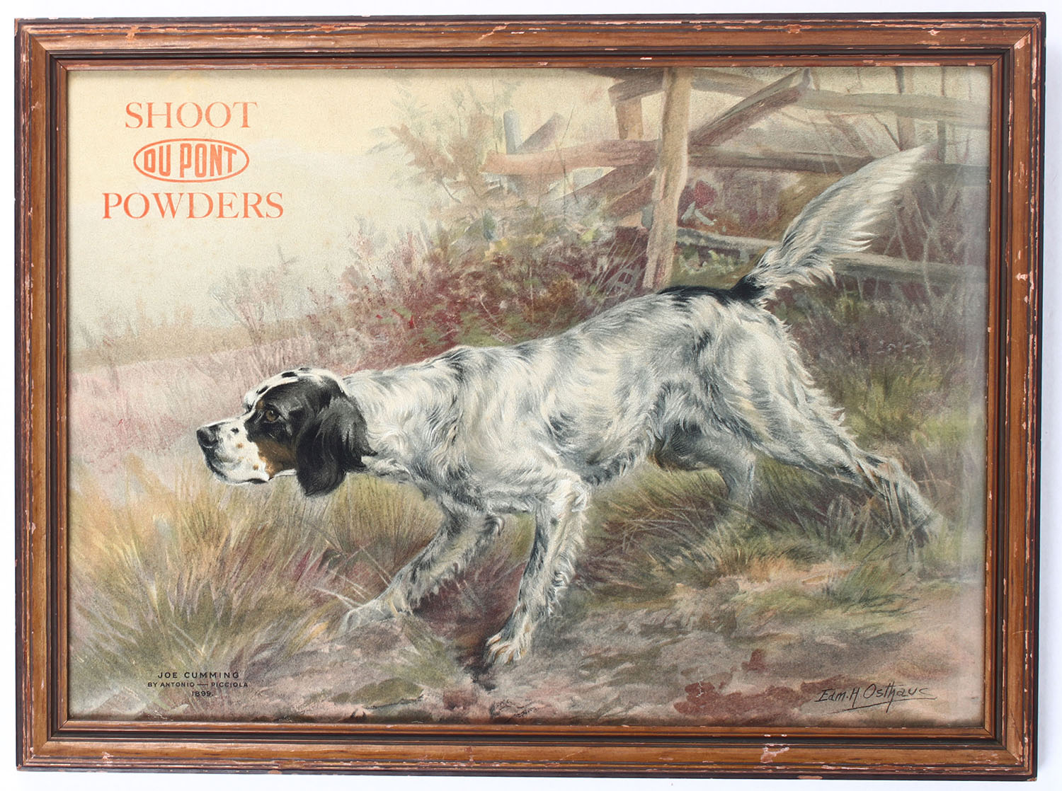 SHOOT DUPONT POWDERS poster, dated 1899, JOE CUMMING, marked Shoot DuPont Powders Artwork by Edwin Osthaus. 22'' x16'', has amazing image with setter on point, framed, excellent colors. Grade: Excellent - Value: 200 to 600