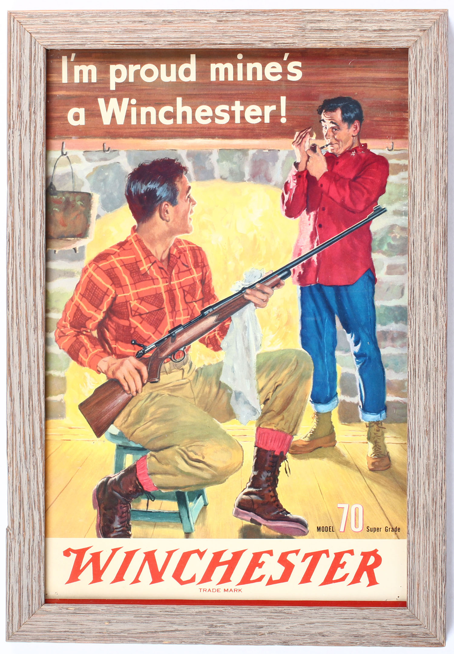 Winchester Diecut for Model 70 Super Grade ''I'm proud mine's a Winchester'', pictures two men in a cabin in front of a fire, one is cleaning his Model 70 & the other is lighting a pipe, no easel back, excellent colors, has a few staple holes, framed, 13'' x 20''. Grade: Excellent + - Value: 50 to 150
