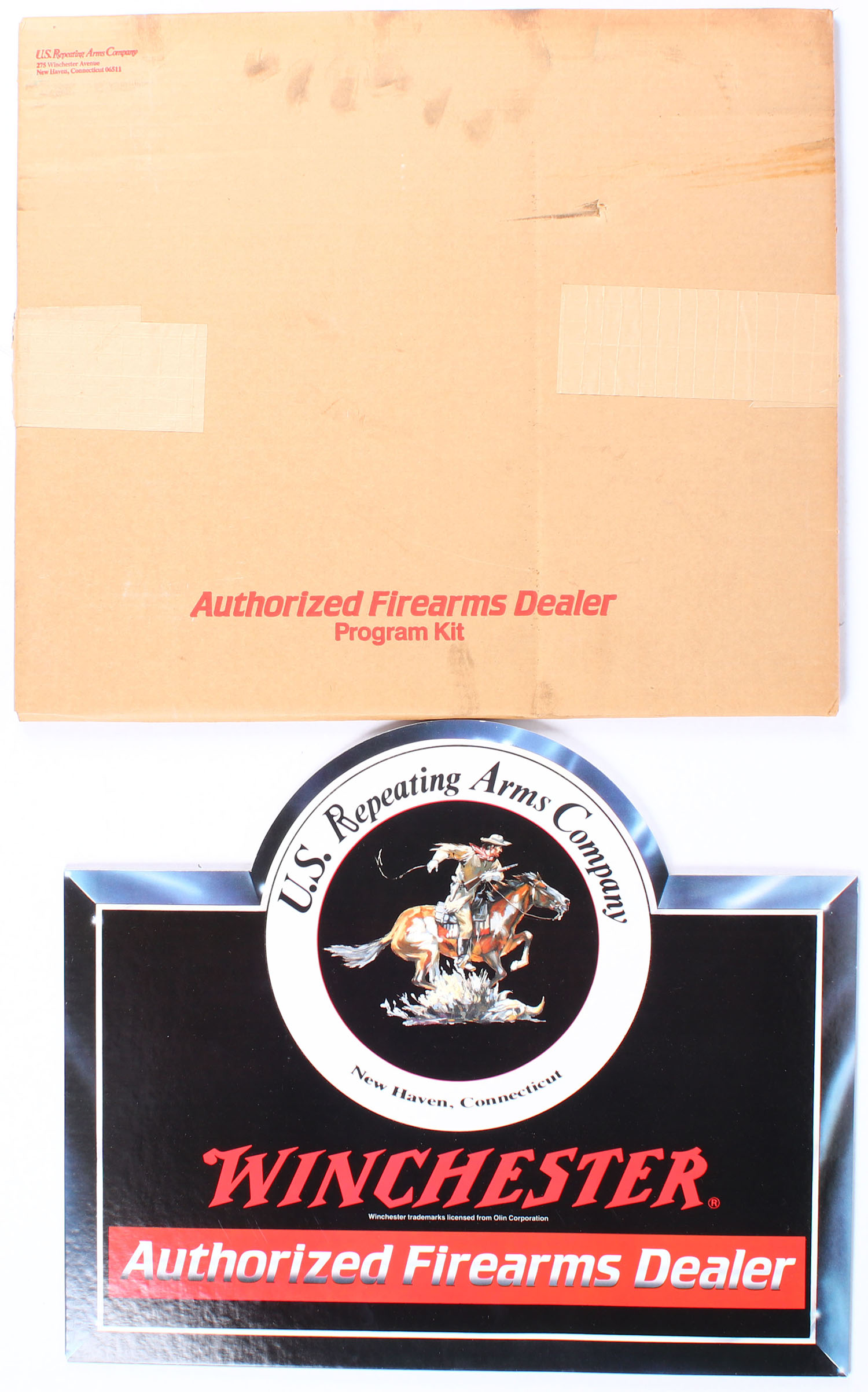 US Repeating Arms Co & Winchester AUTHORIZED FIREARMS DEALER Diecut, features a galloping horseman & the two company names, excellent & bright colors, near mint in every way, glued easel back. 21 3/4'' x 18''. Grade: Excellent ++ - Value: 40 to 100