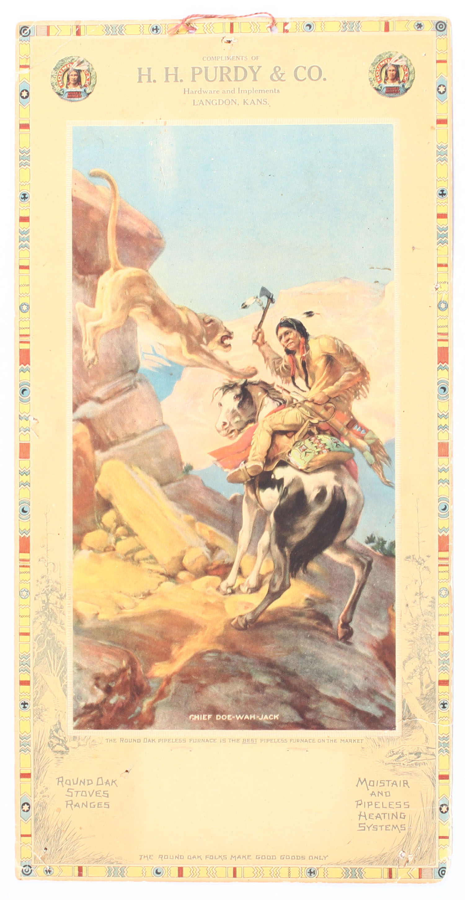 Round Oak Stoves Ranges Calendar, ''CHEIF DOE-WAH-JACK'', compliments of H.H Purdy & Co, pictures a Native American on horseback fighting off an attacking cougar with his hatchet, missing calendar pages, has good colors, self framed with some other bordering patterns & images, tack holes throughout with a few rips & tears 10 1/2'' x 20 3/4''. Grade: Very Good + - Value: 20 to 80