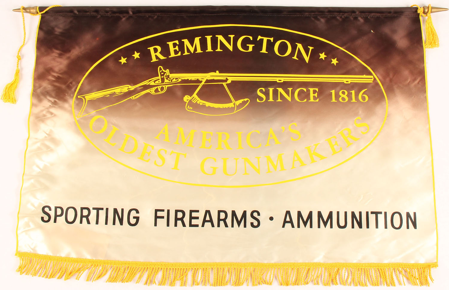 Remington Banner, ''AMERICA'S OLDEST GUNMAKERS'', SPORTING FIREARMS - AMMUNITION, white/brown/yellow, light cracking to the wording, 29 1/2'' x 20 1/2''. Grade: Very Good++ - Value: 40 to 100