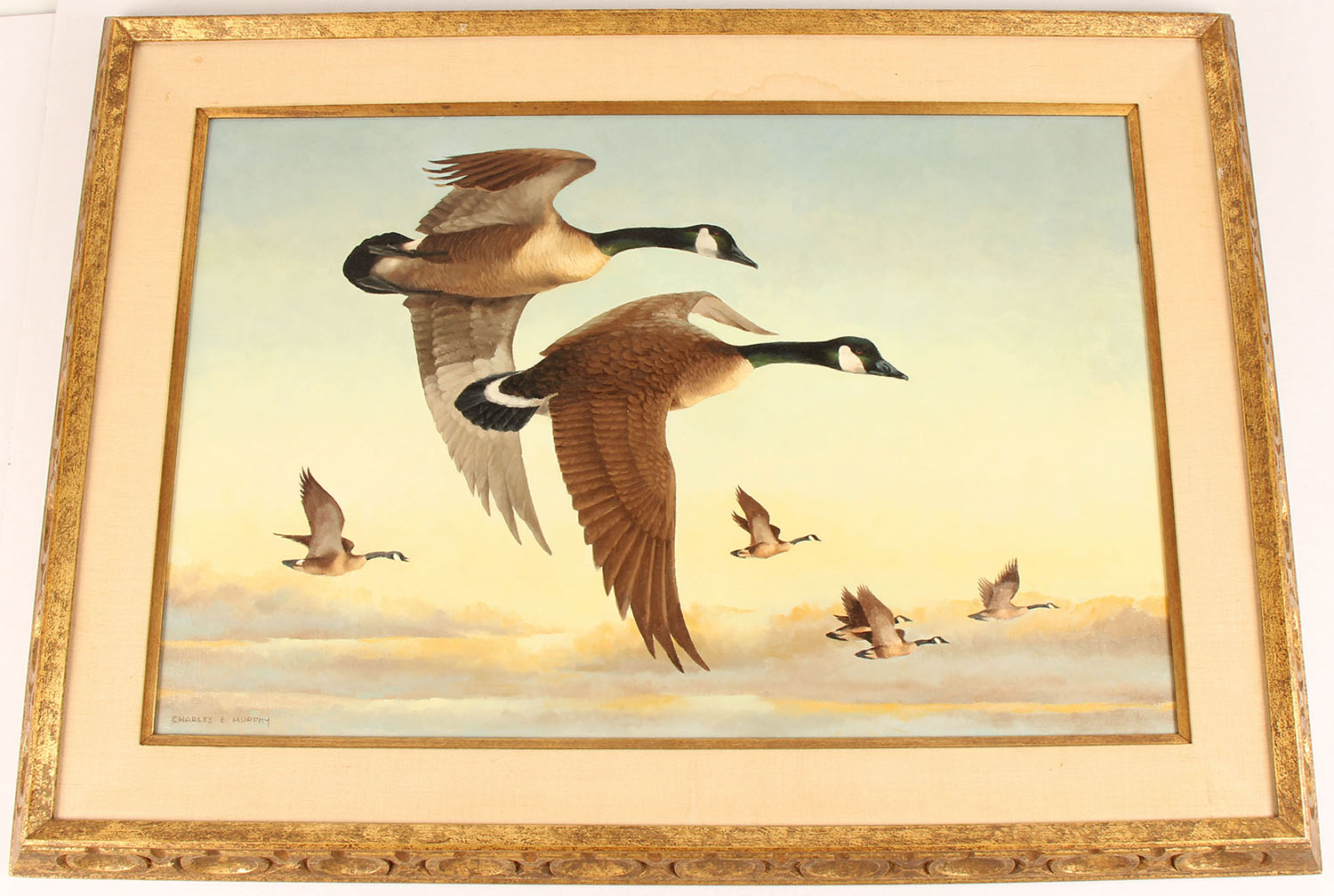 Charles E Murphy, oil on canvas painting, pictures geese in flight, full color image, excellent colors, framed, 38'' x 28''. Grade: Excellent - Value: 50 to 250