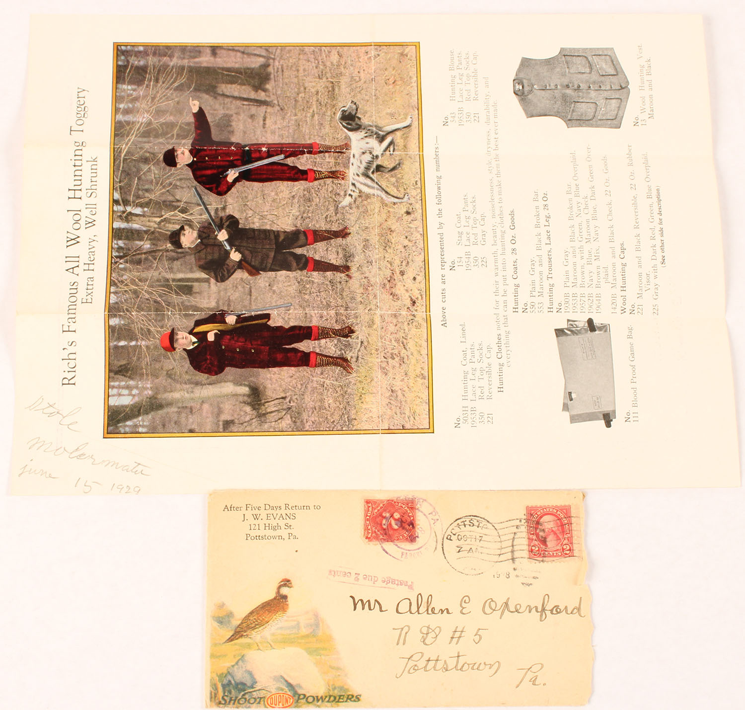 Du Pont Powders Envelope, 1938, features a full color image of a quail perched on a rock, load information on the back side, right side opened. Grade: Very Good - Value: 20 to 80