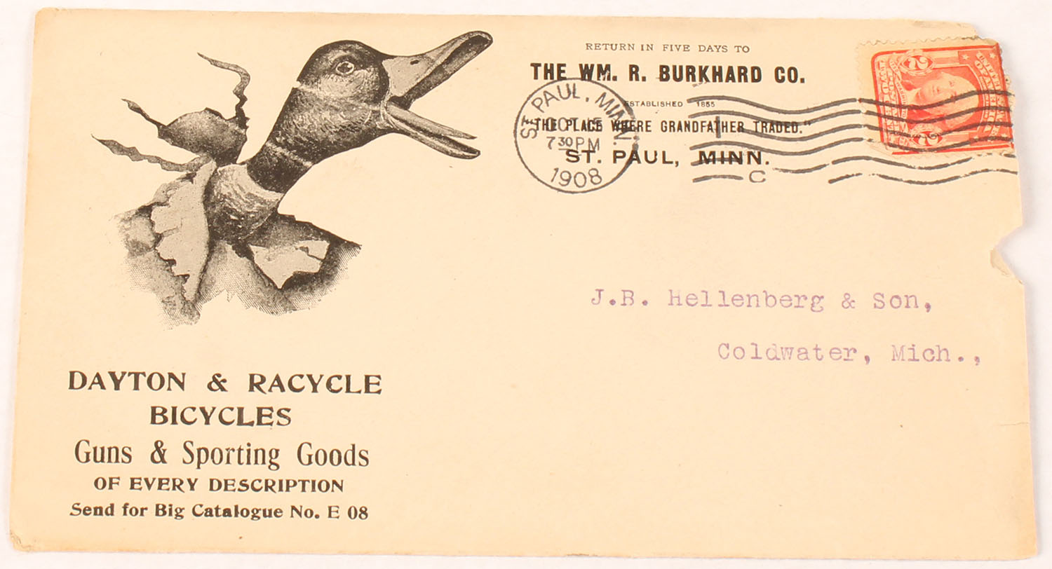 Dayton & Racycle Bicycles Guns & Sporting Goods, 1908, has b/w image of duck coming out of envelope & advertisement on back for bicycle gears/ brakes, light age soiling, opened on right side. Grade: Very Good ++ - Value: 20 to 80