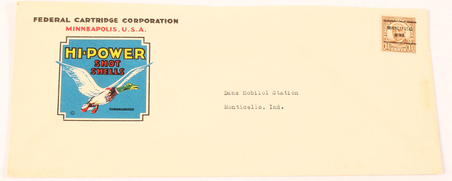 Federal Cartridge Corp. ''HI-POWER SHOT SHELLS'' Envelope, no date, features a full color image of a Hi-Power shotshell box, blank back. Grade: Excellent - Value: 20 to 80