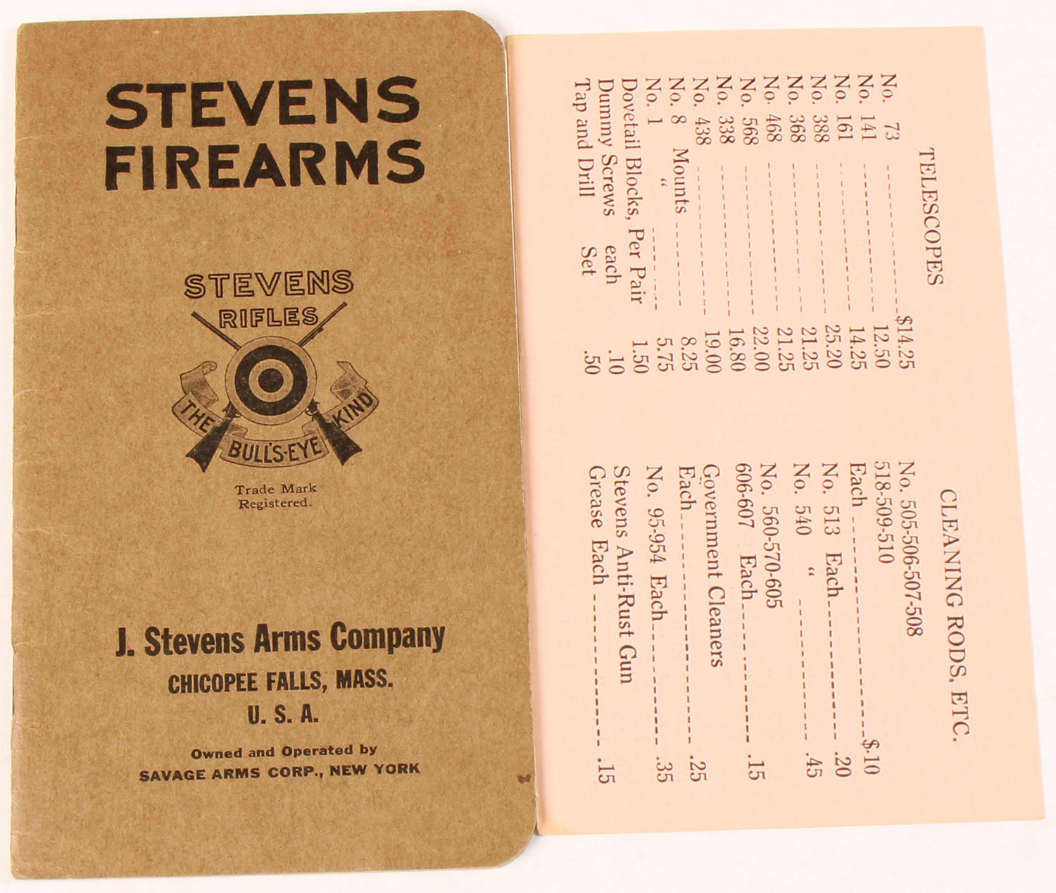 J. Stevens Arms Company, ''STEVENS FIREARMS'' Price List Booklet & Revised Price List. Grade: Excellent + - Value: 10 to 50