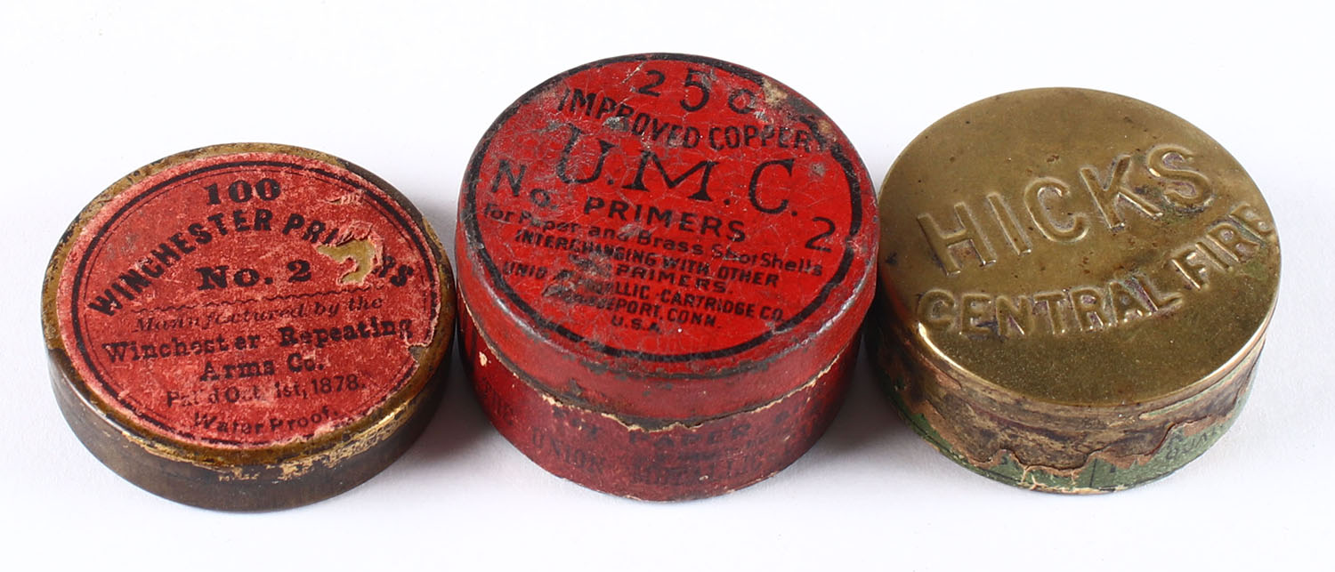 Lot of 3 primer tins, various manfs. 2 partial 1 empty . Grade: Excellent - Value: 16 to 50