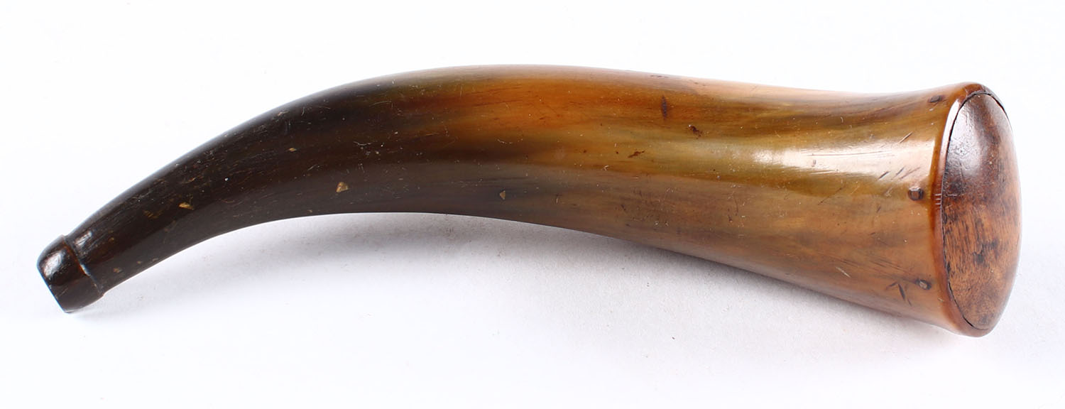 Small Power horn, unmarked, 8'' OAL, cork cap stuck in and powder still inside, crack to small end. Grade: Very Good - Value: 16 to 50